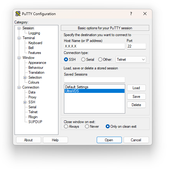 На следующем шаге запустите PuTTY. На начальной вкладке укажите имя или IP-адрес сервера в строке Host Name (or IP address), а в поле Saved Sessions введите название сохраняемой сессии. Затем нажмите Save.