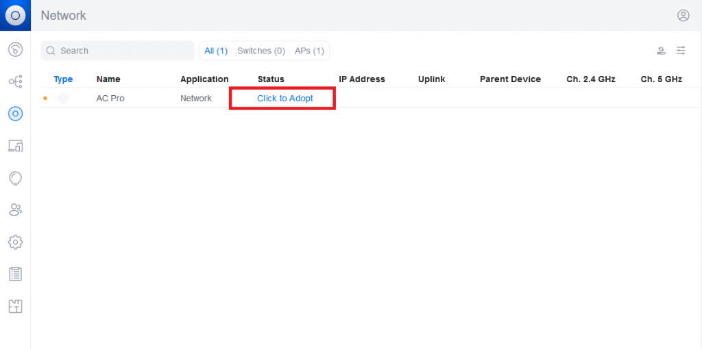 После выполнения команды точка доступа должна появиться в соответствующем списке UniFi Network Server. Чтобы запустить процесс её привязки к вашему контроллеру UniFi, кликните на Click to Adopt.