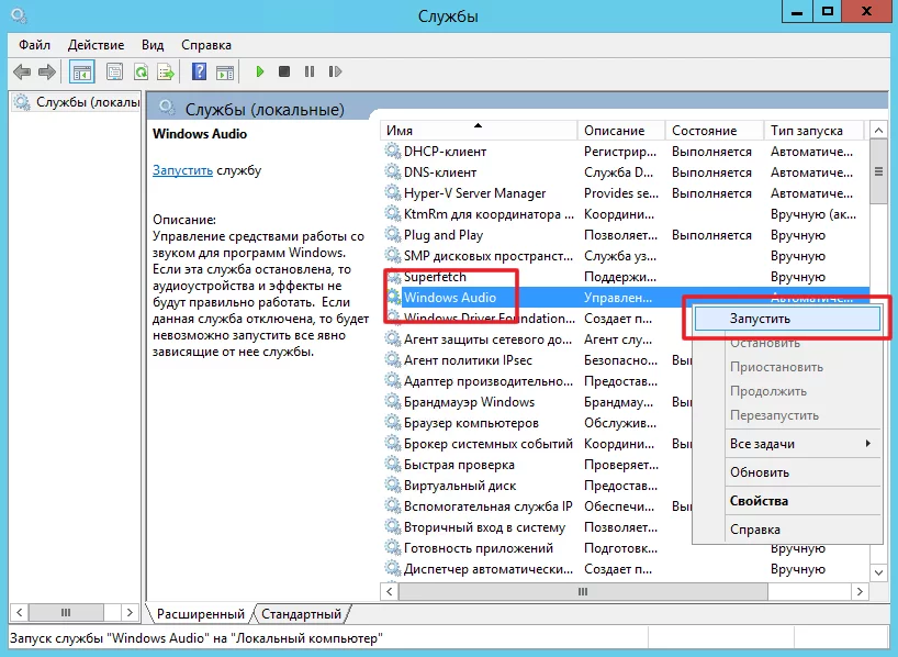 Запуск службы Windows Audio