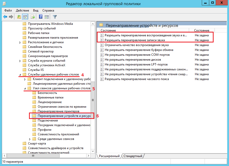 Конфигурация компьютера -> Административные шаблоны -> Компоненты Windows -> Службы удалённых рабочих столов -> Узел сеансов удалённых рабочих столов -> Перенаправление устройств и ресурсов -> Разрешить перенаправление воспроизведения звука и видео