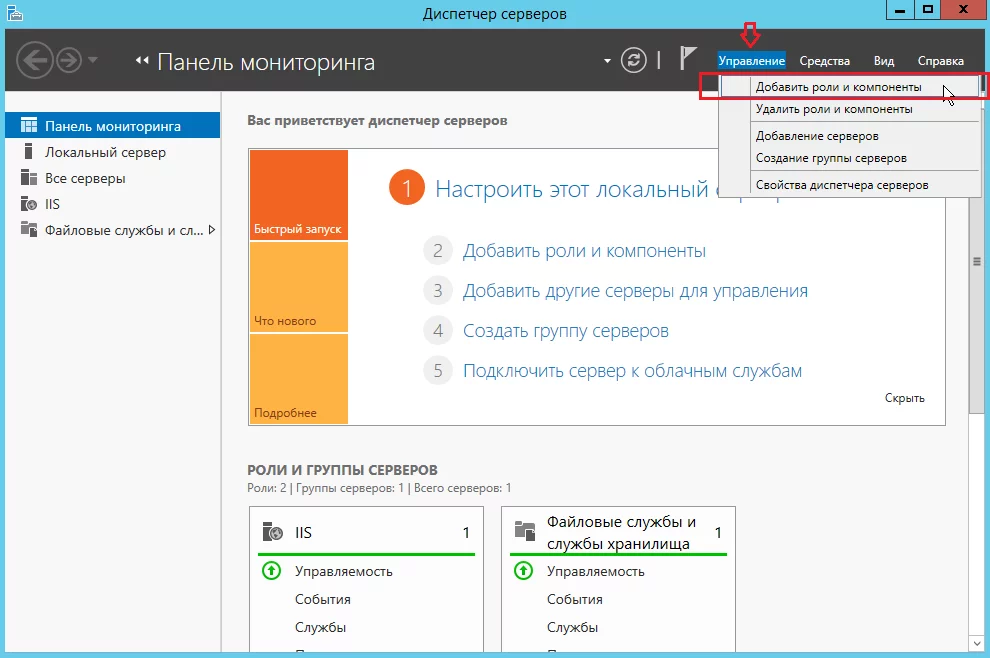 Теперь откройте на сервере «Диспетчер серверов», в верхнем меню нажмите «Управление» и выберите пункт «Добавить роли и компоненты».