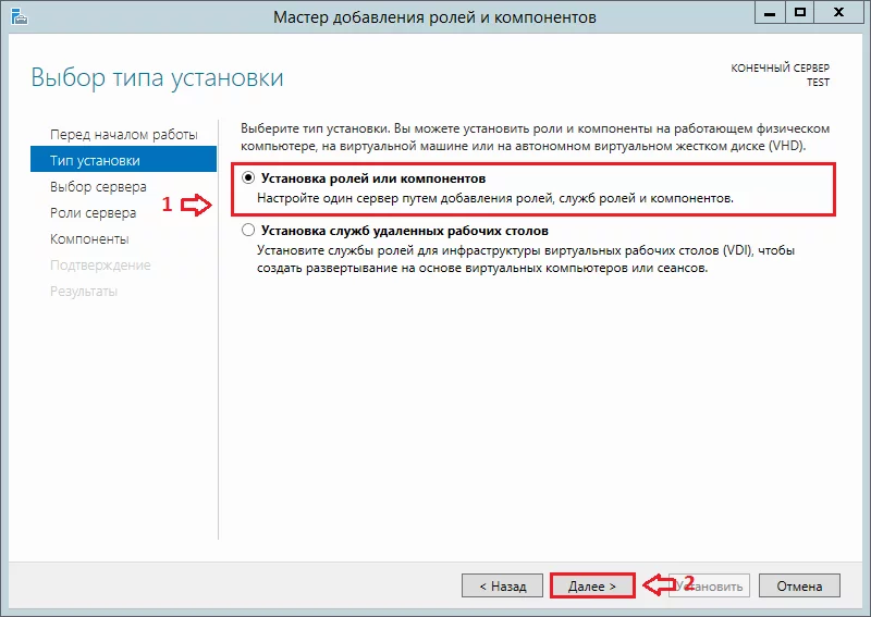 На первом шаге выберите «Установка ролей или компонентов».