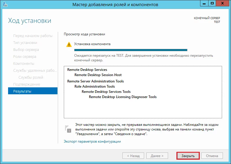 После завершения установки нажмите кнопку «Закрыть» и перезагрузите сервер.
