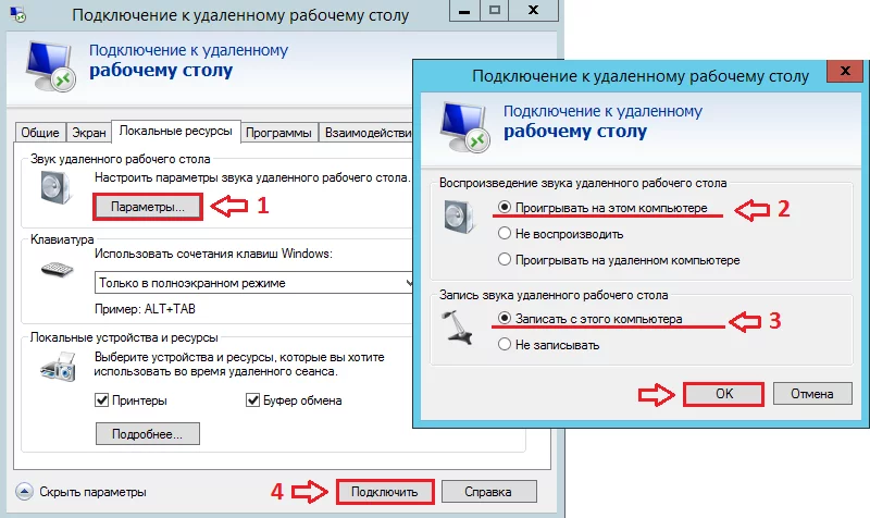 Далее откройте программу «Подключение к удаленному рабочему столу». На вкладке «Общие» укажите IP-адрес вашего сервера, как при стандартном подключении. Затем перейдите на вкладку «Локальные ресурсы», нажмите кнопку «Параметры» и в открывшемся окне выберите пункты «Проигрывать на этом компьютере» и «Записать с этого компьютера». После этого нажмите «ОК» и затем «Подключить».