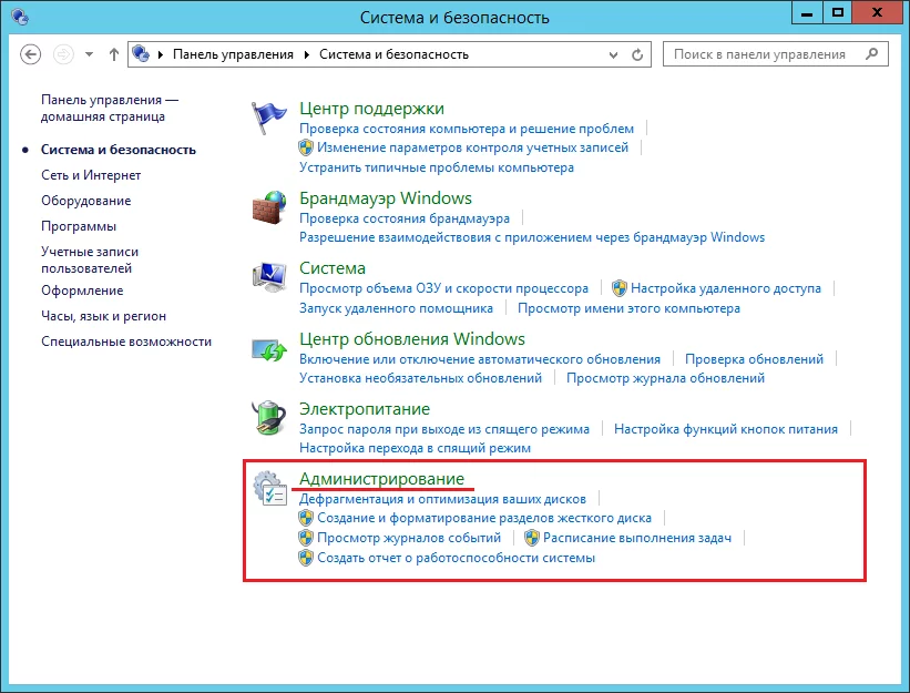 В окне «Система и безопасность» выберите пункт «Администрирование».